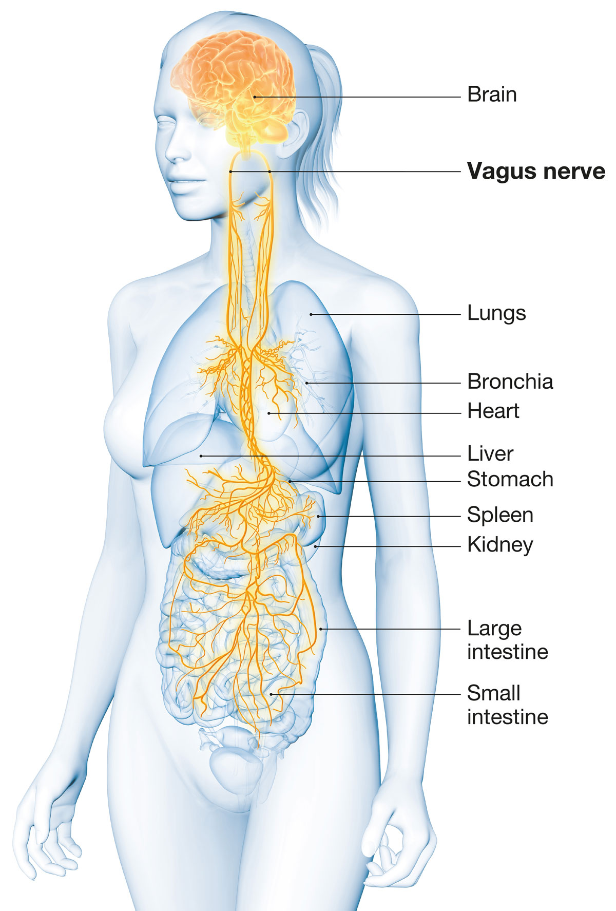 Continuing its descent, the vagus nerve enters the abdominal cavity, where it interacts with a myriad of organs, including the stomach, liver, pancreas, kidneys and intestines. This remarkable nerve establishes an intricate web of communication, coordinating essential processes such as digestion, nutrient absorption, gut motility and much more. Let's explore what we know about the vagus nerve's incredible impact within this intricate domain of the body.